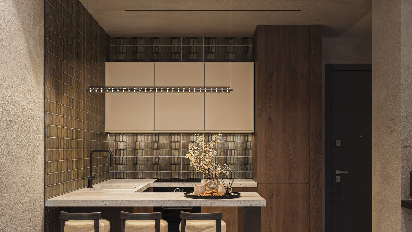 In the interior design project of the private house, modernity meets classical elegance in perfect harmony. Our vision for this space was to seamlessly blend contemporary elements with timeless classical design, creating a captivating ambiance that exudes warmth and sophistication. Upon entering, you're immediately greeted by a sense of serenity as natural light floods the room, enhancing the beauty of the carefully selected materials. The foundation of this design is built upon the richness of wood, with oak floors extending throughout, complemented by accents of walnut and mahogany, adding depth and character to the space.
