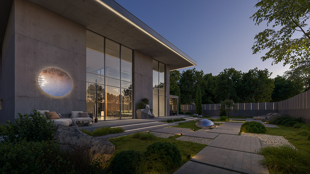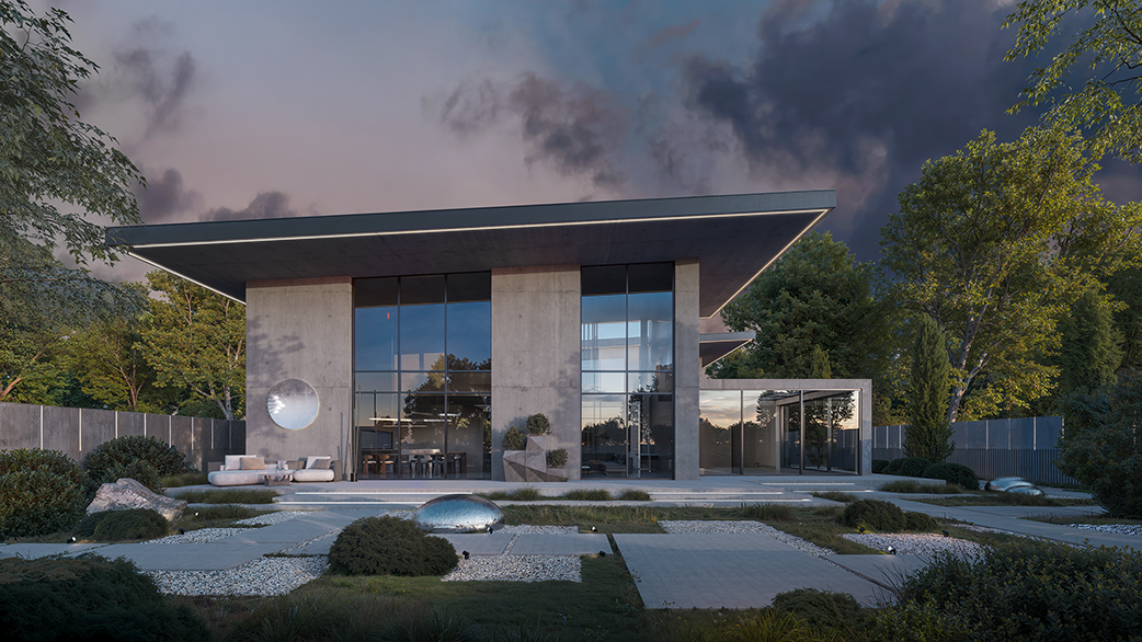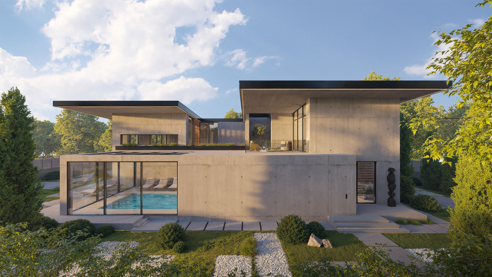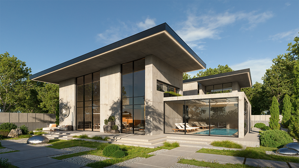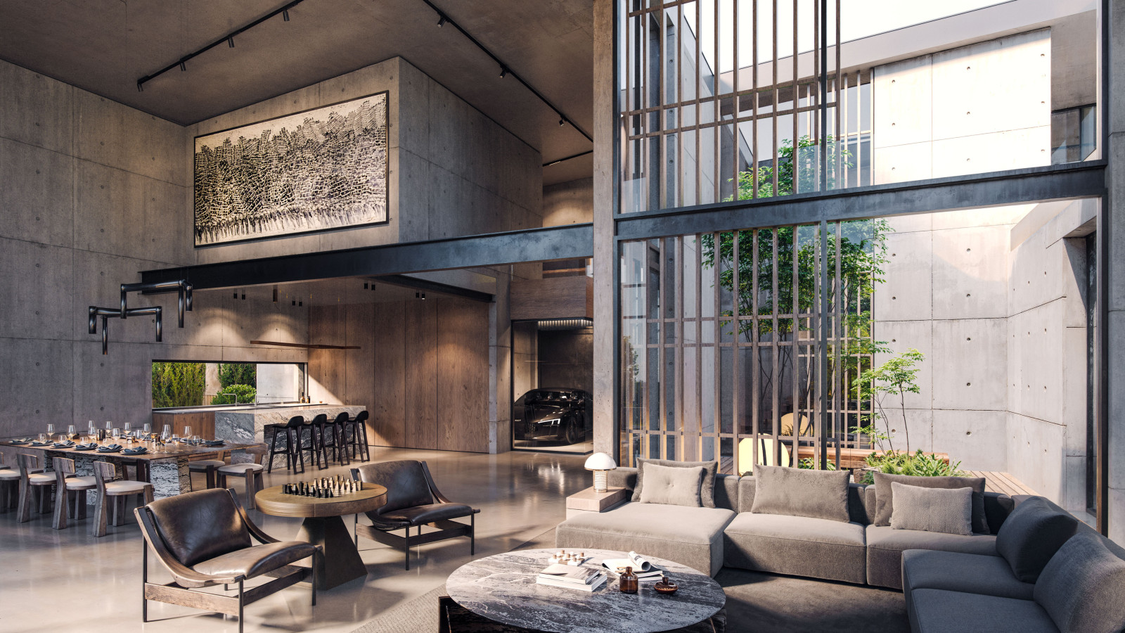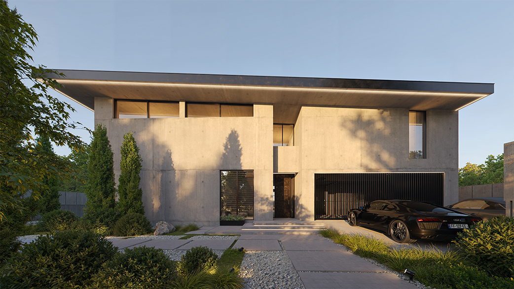 The contemporary residence is a statement of modern architecture, seamlessly integrating natural materials, open spaces, and breathtaking views. Framed by a dramatic mountain backdrop, the house embraces a minimalist yet warm aesthetic, with a sophisticated combination of concrete, glass, and natural wood. The home’s clean geometric lines and cantilevered structures create a bold yet inviting presence. The use of raw concrete lends an industrial elegance, while the vertical wooden cladding softens the aesthetic, adding warmth and texture. Expansive floor-to-ceiling glass doors and windows blur the line between indoors and outdoors, enhancing the connection to nature while allowing abundant natural light to flood the interiors.
